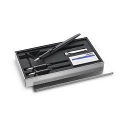 Set i en attraktiv presentask av metall. Denna ask innehåller en LAMY joy kalligrafi-reservoarpenna i mattsvart lackfinish med huv i aluminium, tre utbytbara greppdelar med polerade stålspetsar i bredderna 1,1 mm, 1,5 mm och 1,9 mm, ett paket med 5 bläckpatroner samt en broschyr.